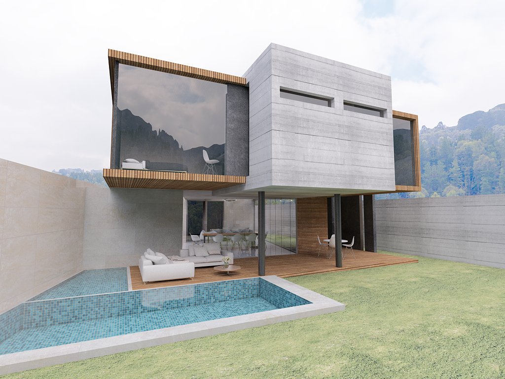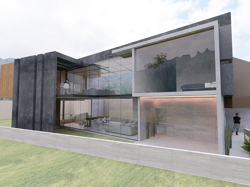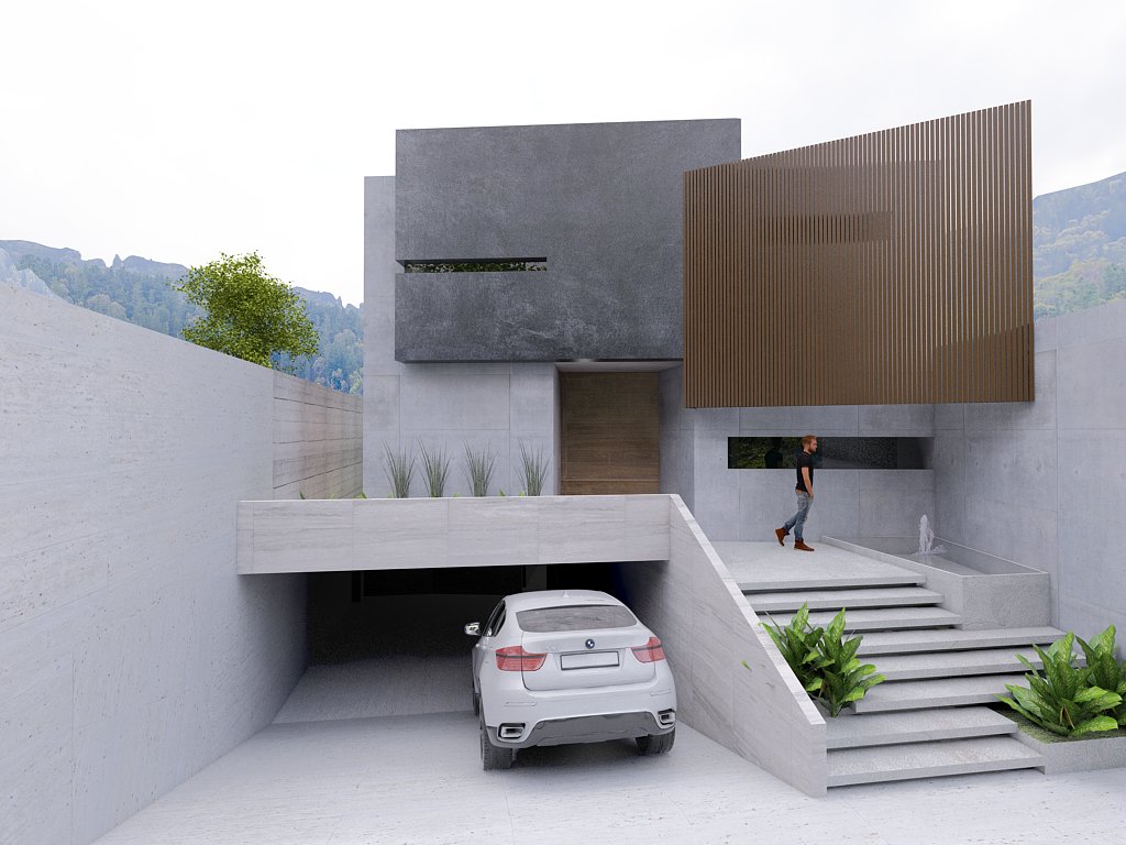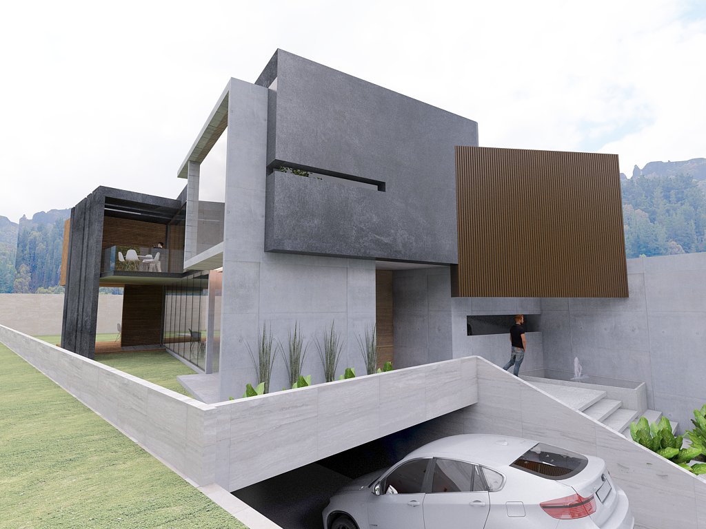 Para este espacio decidimos jugar con los volúmenes tanto como fuera posible, eliminando por completo los aspectos “planos” y deconstruyendo cada una de las habitaciones para que lucieran por sí mismas. Lo primero fue jugar con el espacio estacionamiento para elevar la casa que parece compuesta de bloques de habitaciones sobrepuestas. La fachada aunque con una vista hermética, muestra los materiales que hallaremos alrededor de toda la construcción y nos da una muestra de la volumetría que usamos para todo el proyecto.