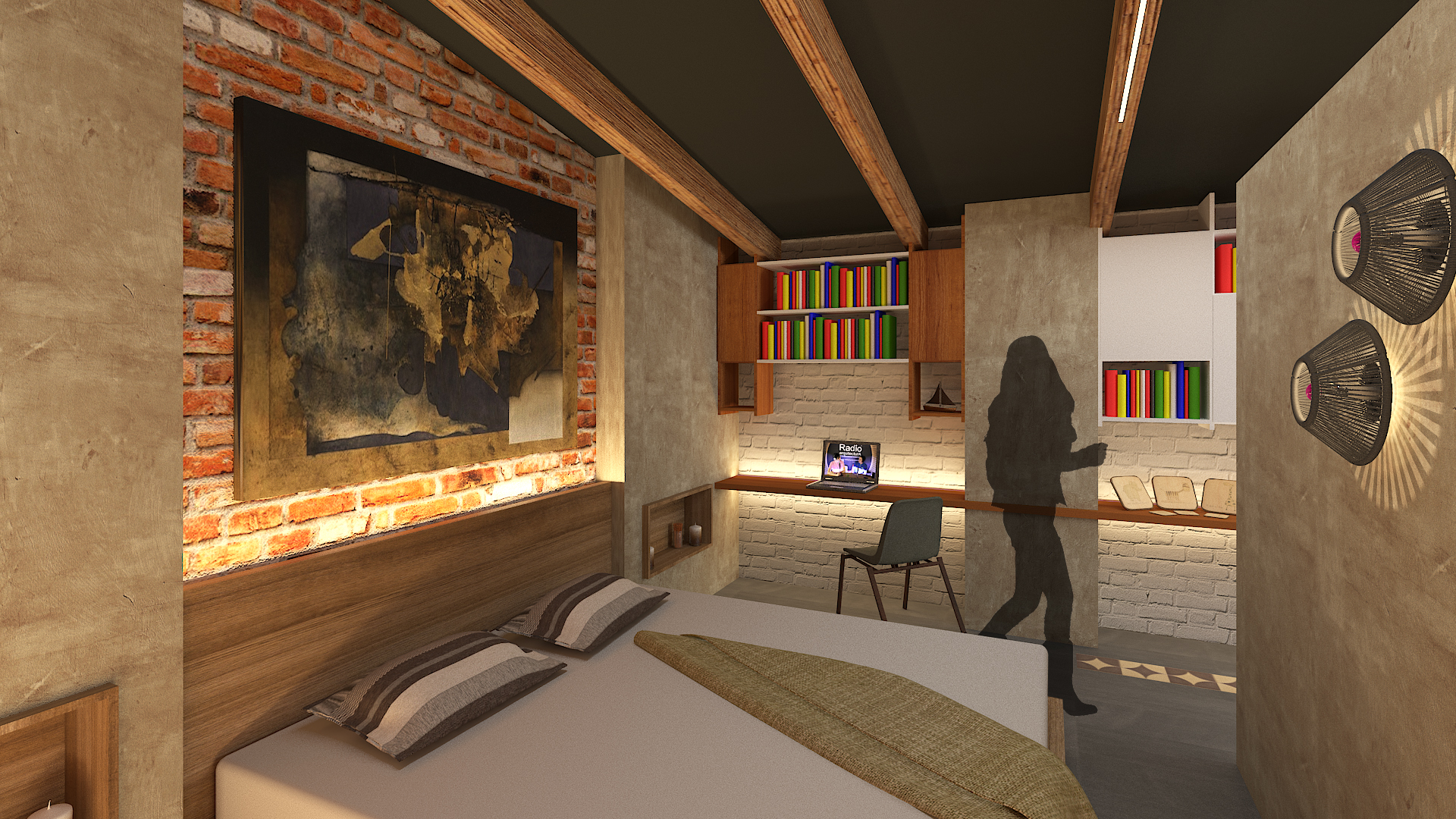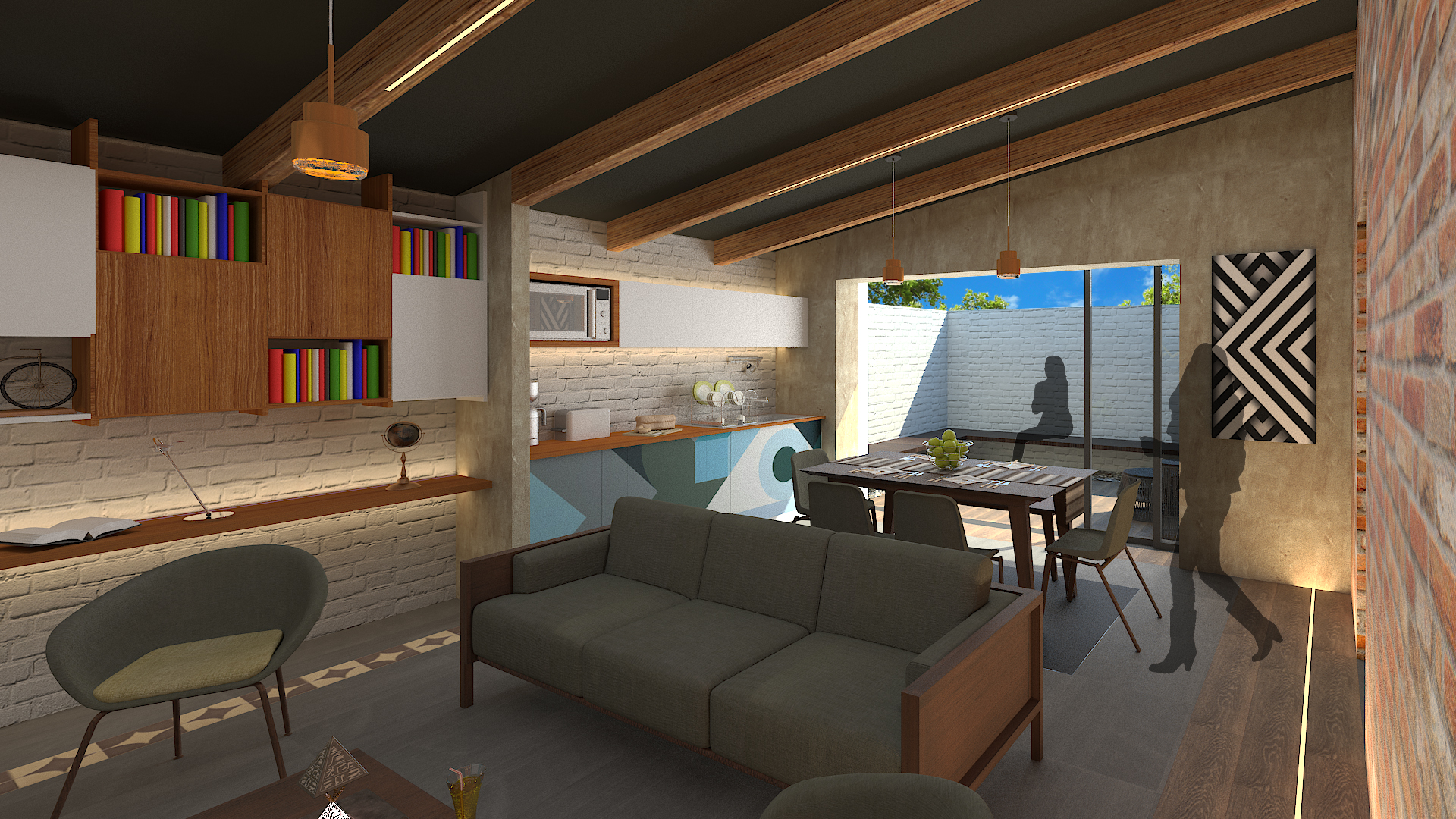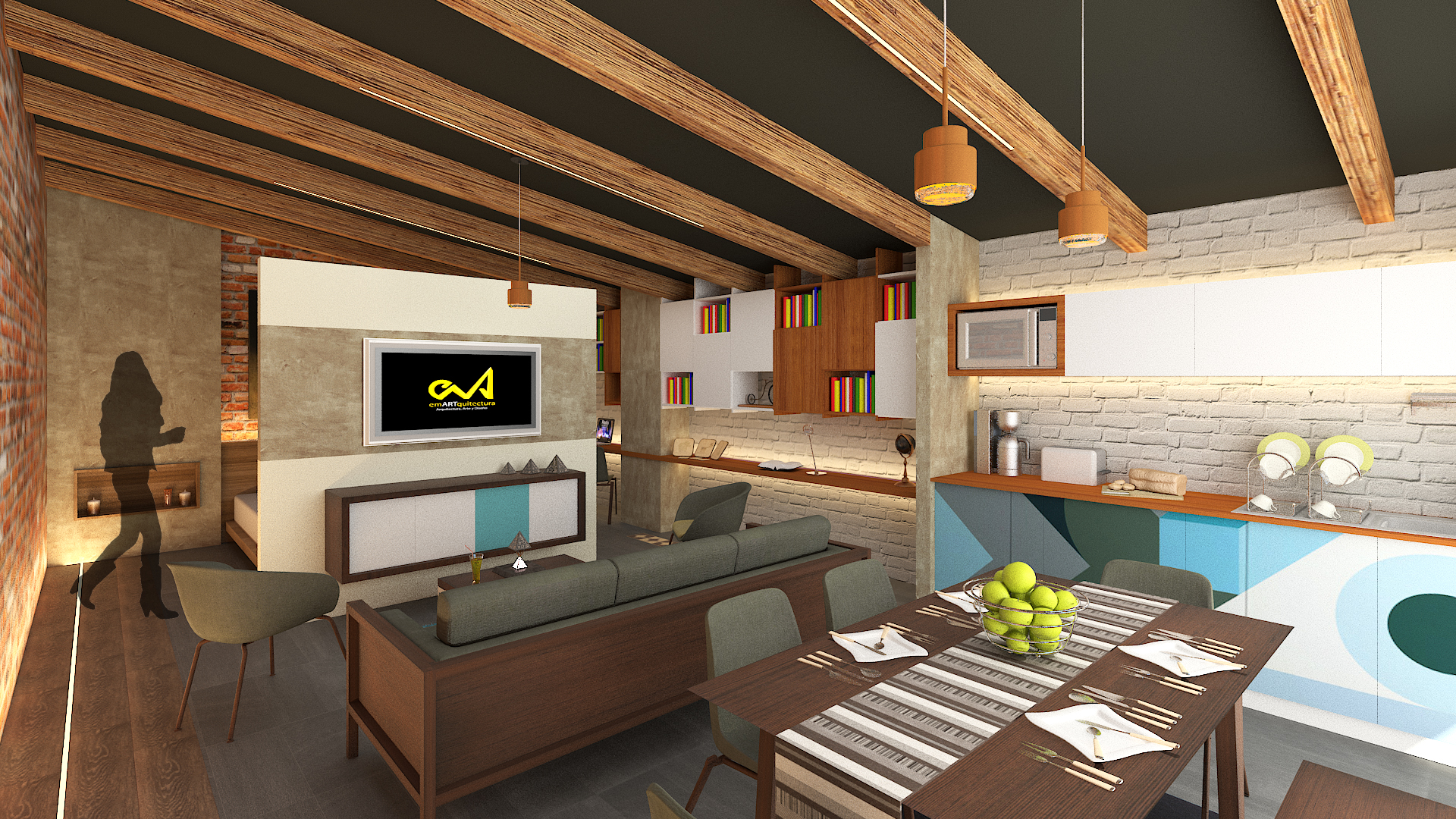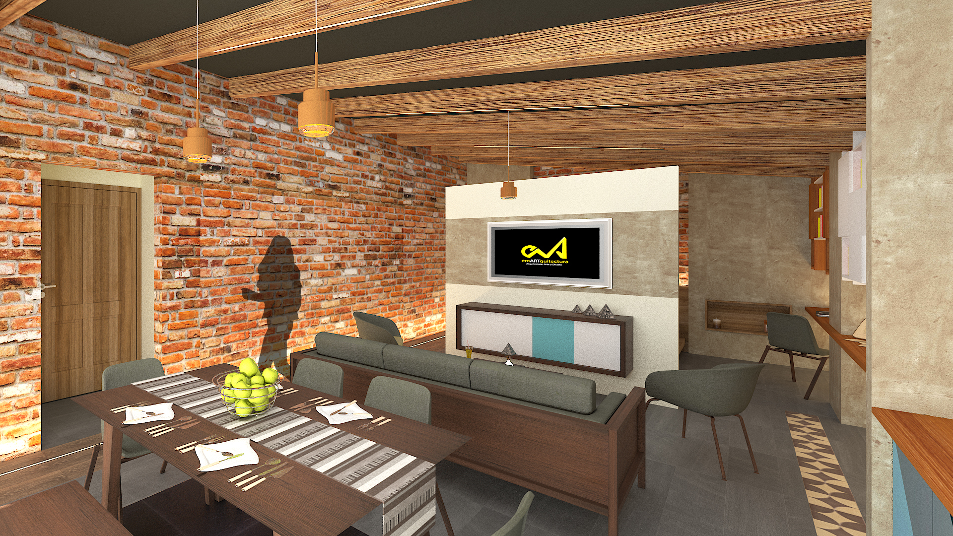 CASA-ESTUDIO busca aprovechar, rescatar y exhibir los materiales existentes del sitio, integrando acabados y mobiliario que convergen con los mismos; así como reforzar la iluminación y ventilación actual del espacio. Buscamos generar espacios abiertos y libres pero con interacción entre los mismos, donde uno pueda realizar tareas multidisciplinarias en un mismo espacio o mobiliario; por ejemplo, una mesa que funcione de comedor, como mesa de trabajo y en ocasiones poder ser utilizada en el exterior durante algún evento social. Nuestra intención es crear un espacio que tenga una gran versatilidad en su funcionamiento y vida.