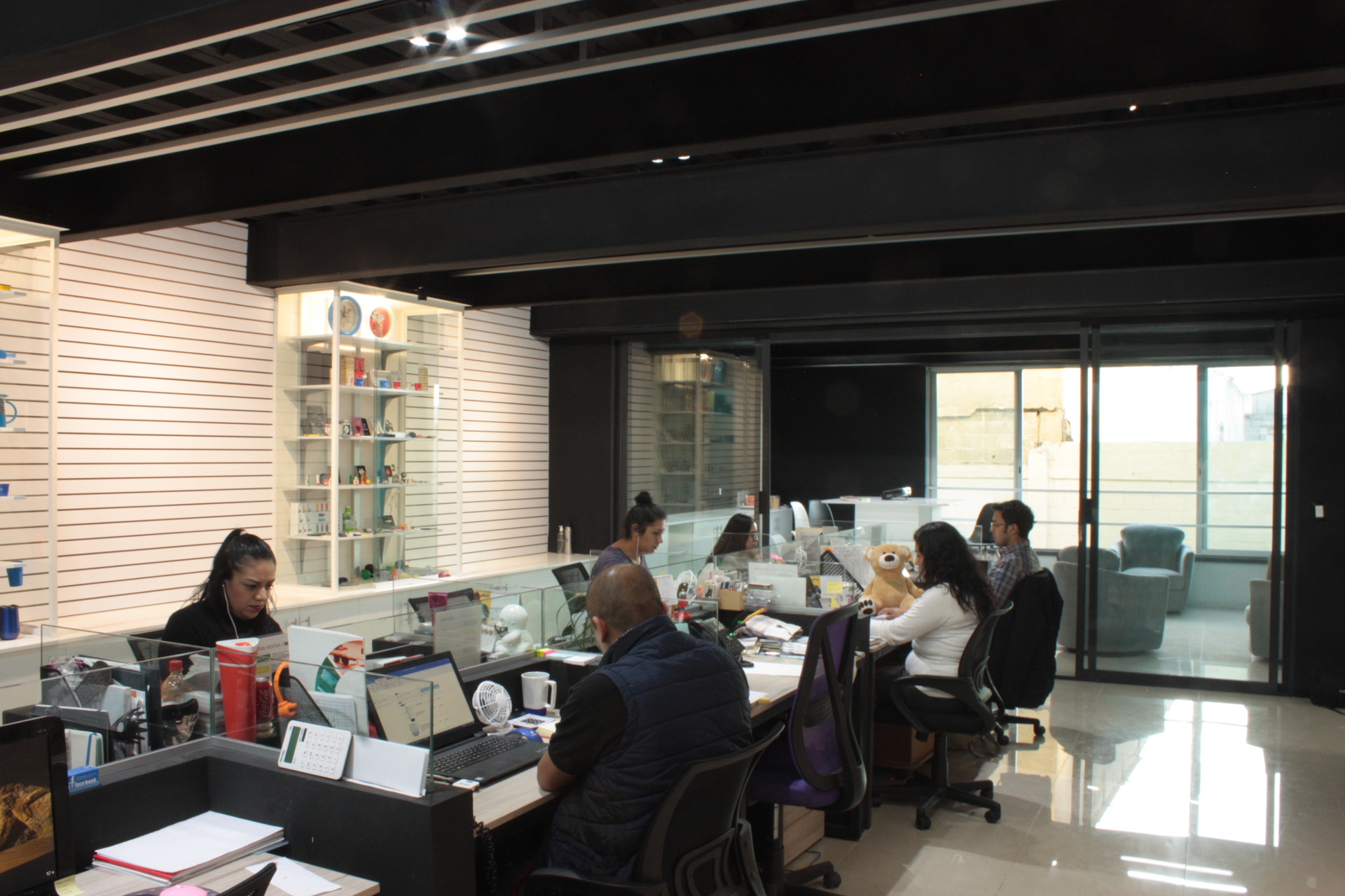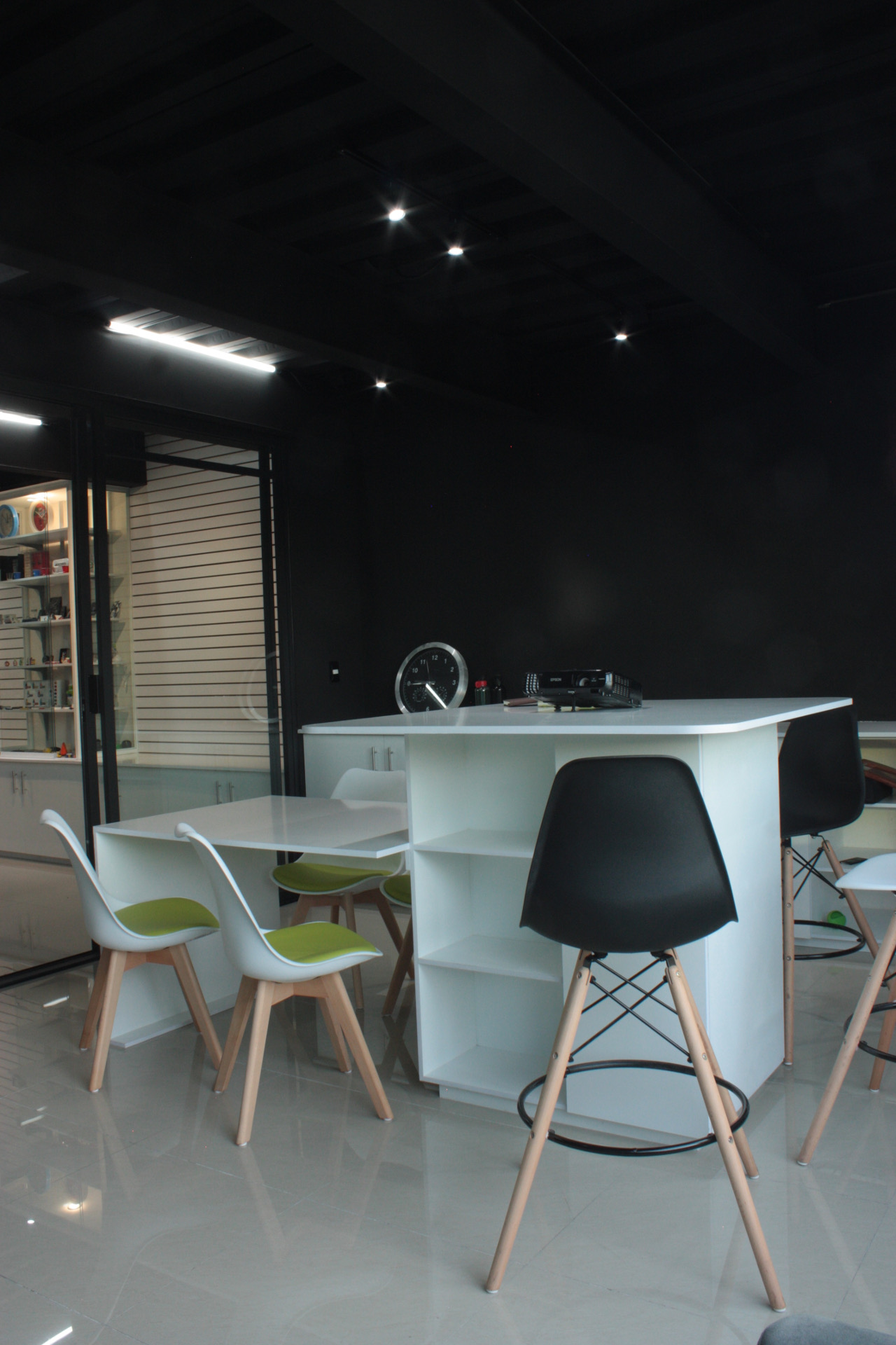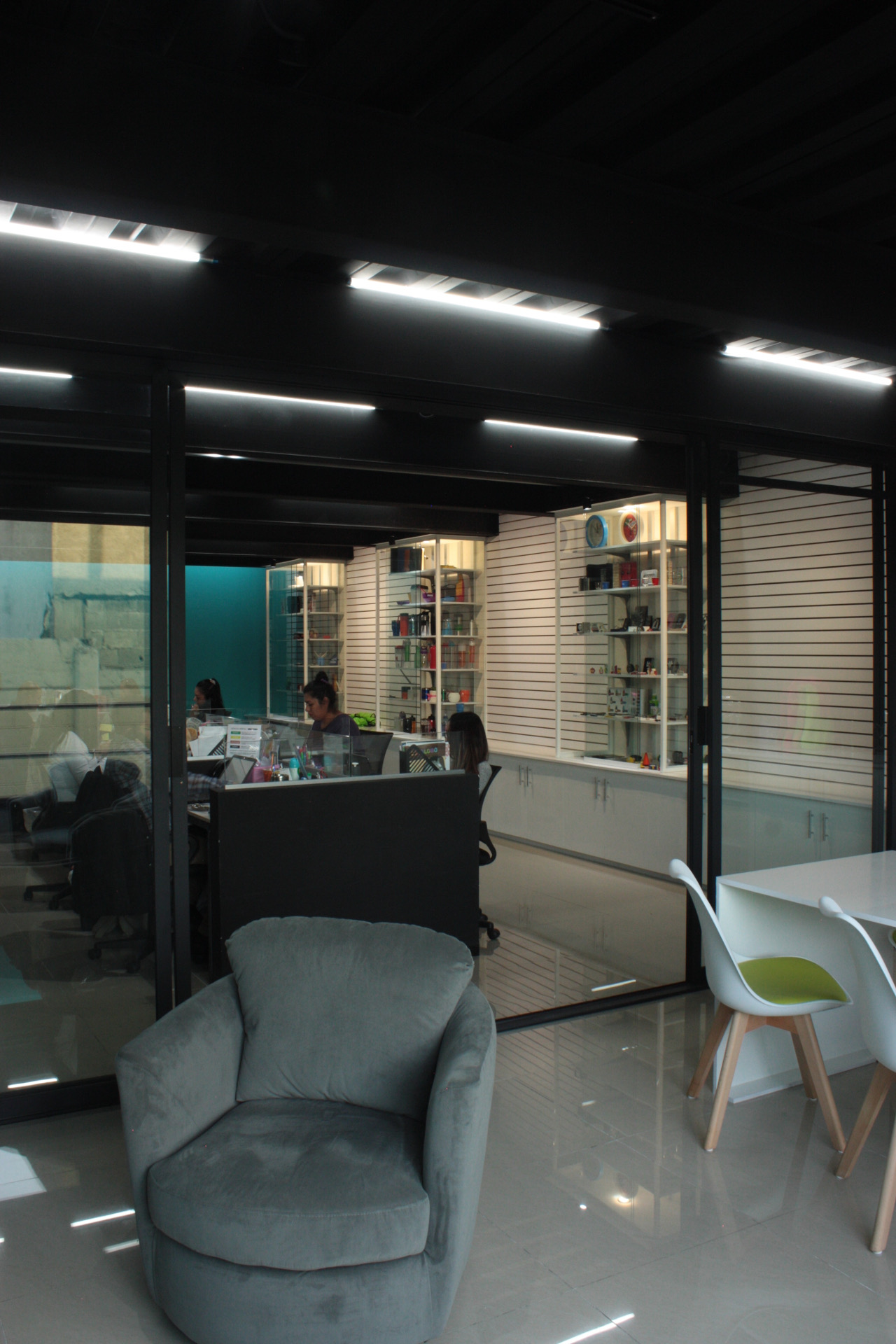 Este espacio de trabajo se trata de integrar a todos los trabajadores sin disponer de su privacidad, para esto se utilizó mobiliario bajo separado por cristales lo que nos permitió que todos los trabajadores se sintieran como parte de un conjunto al tiempo que conservaban su individualidad. Para las vitrinas y los mostradores se diseñaron estantes que dejaran pasar la luz mostraran todos sus productos y los volvían protagonistas del espacio. Usamos colores sobrios pero contrastantes que generarán un impacto visual en los visitantes pero que al acostumbrarse se sintieran como en casa.