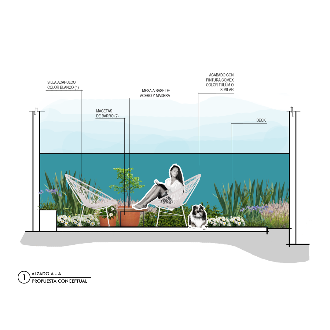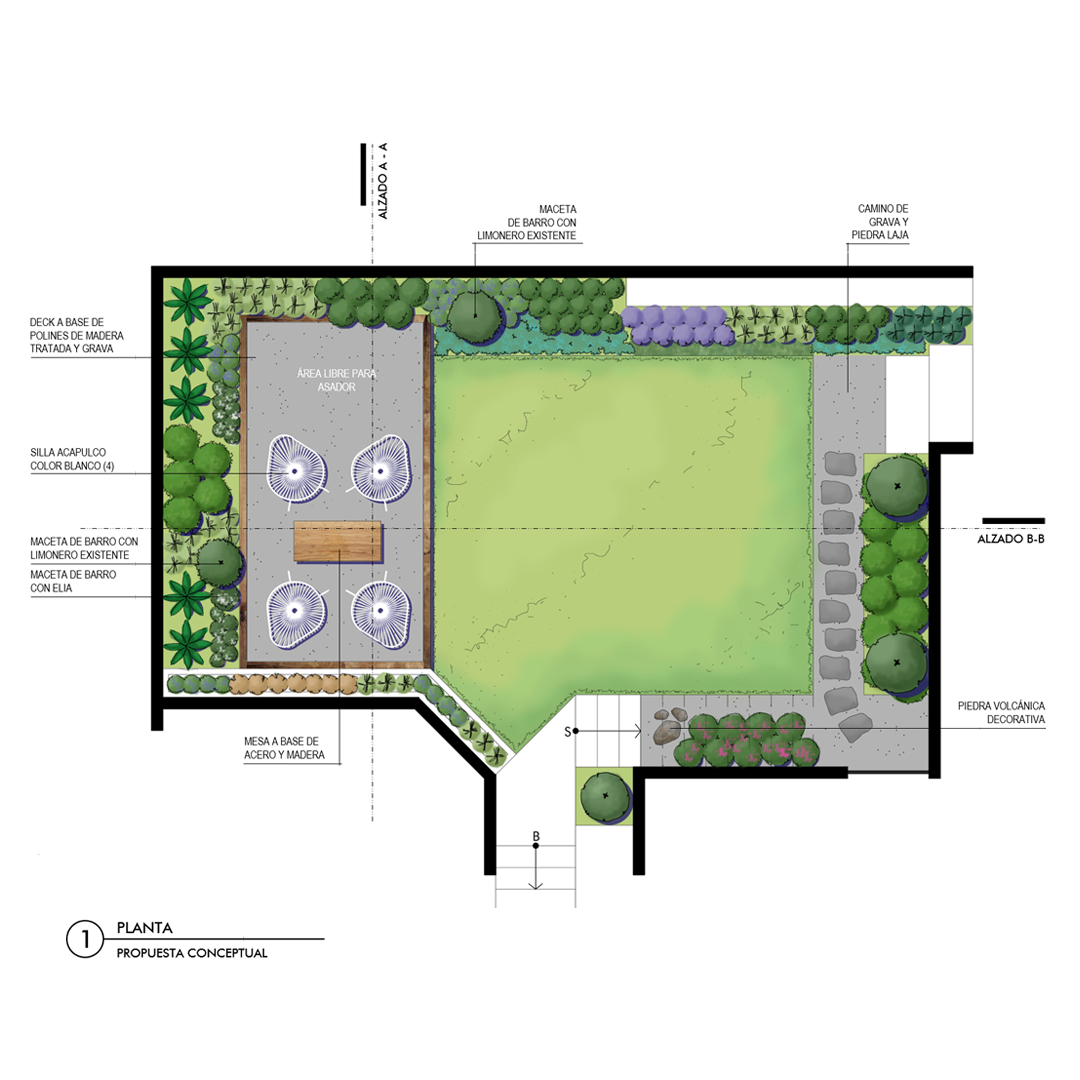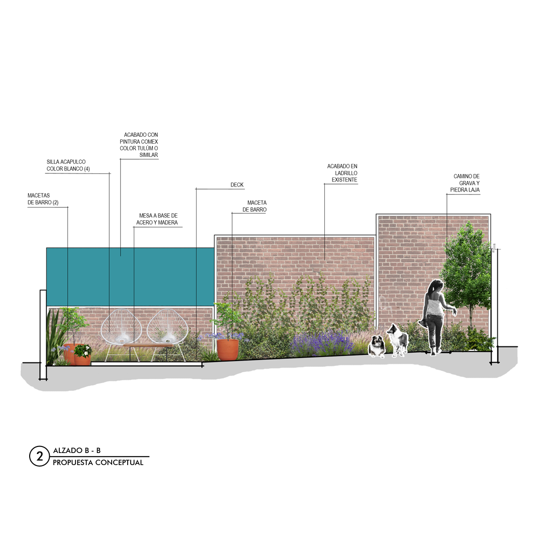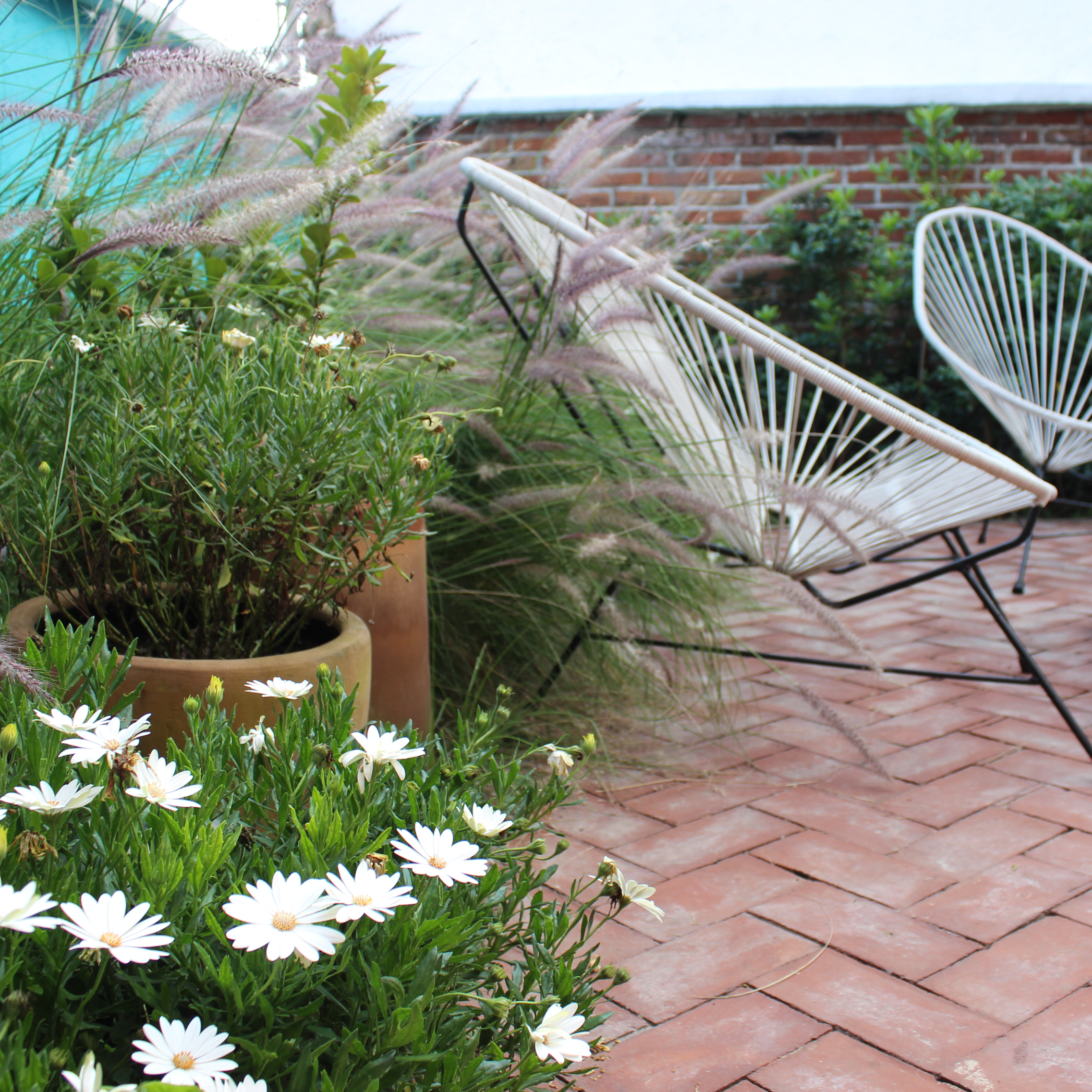 Renovación de un jardín residencial que incluyó la construcción de un área de estar con piso de ladrillo y madera, una banca con esos mismos materiales y la introducción de nuevo mobiliario que pudiera utilizar toda la familia. También se reemplazaron la mayoría de las plantas por nuevas especies de bajo requerimiento de riego y mantenimiento.